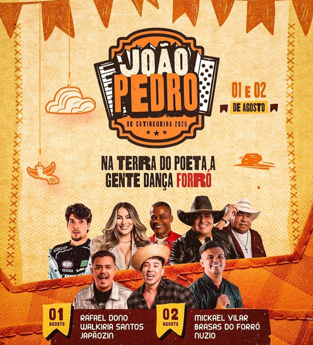 A Prefeitura Municipal de Catingueira, por meio da Secretaria de Cultura, anunciou nesta quarta-feira, 02 de julho, a programação oficial do tradicional João Pedro 2025. Com o slogan “Na terra do poeta a gente dança forró”, o evento é considerado o melhor do Vale do Piancó e promete dois dias de festa, cultura e muito forró no município.